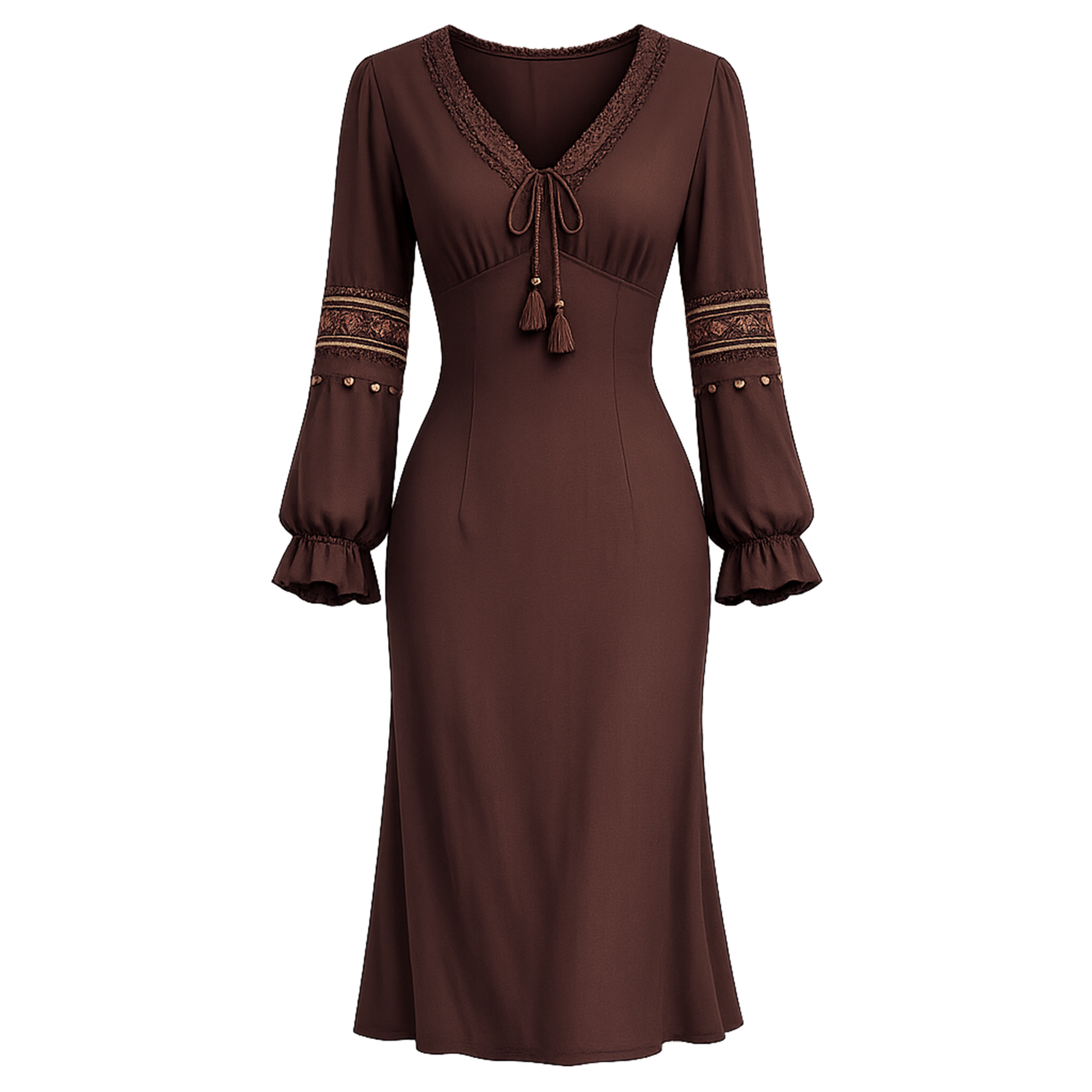This chocolate-brown midi dress delivers a sleek silhouette with soft boho detailing. Designed with a flattering V-neck and tassel tie, it features lace trim along the neckline and intricate embroidered bands on the sleeves, finished with subtle bead accents. The long balloon sleeves with ruffled cuffs balance the fitted body for an elegant, feminine look—perfect for date nights, dinners, fall events, and elevated everyday wear.